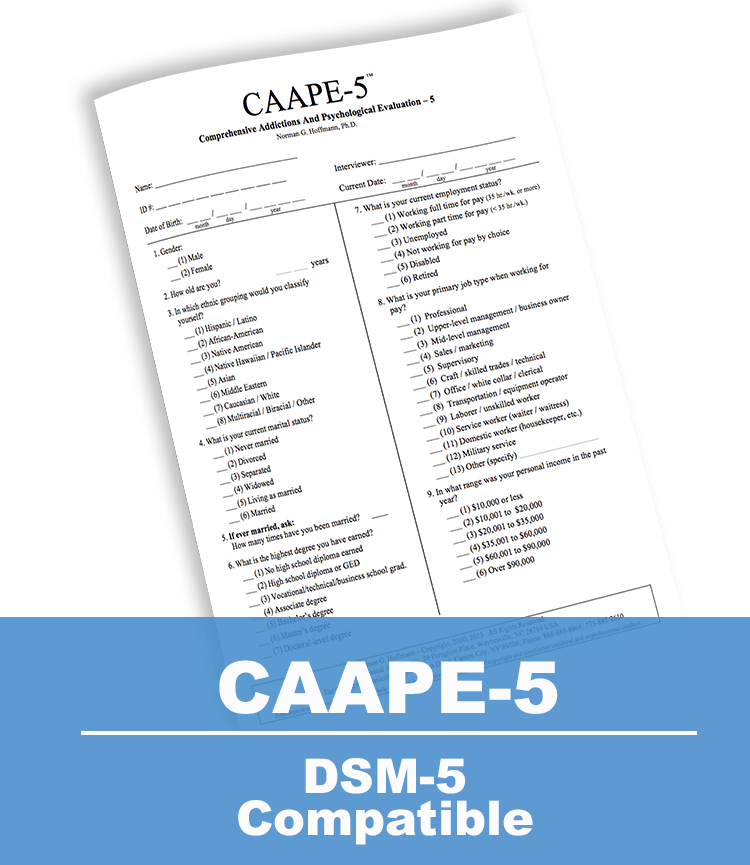 The CAAPE-5 is a comprehensive diagnostic assessment interview providing documentation for substance-specific diagnoses based on DSM-5 criteria. In 20-35 minutes, the CAAPE-5 covers some of the more prevalent mental health conditions likely to impact recovery from substance use disorders and collects key demographic information associated with prognosis.