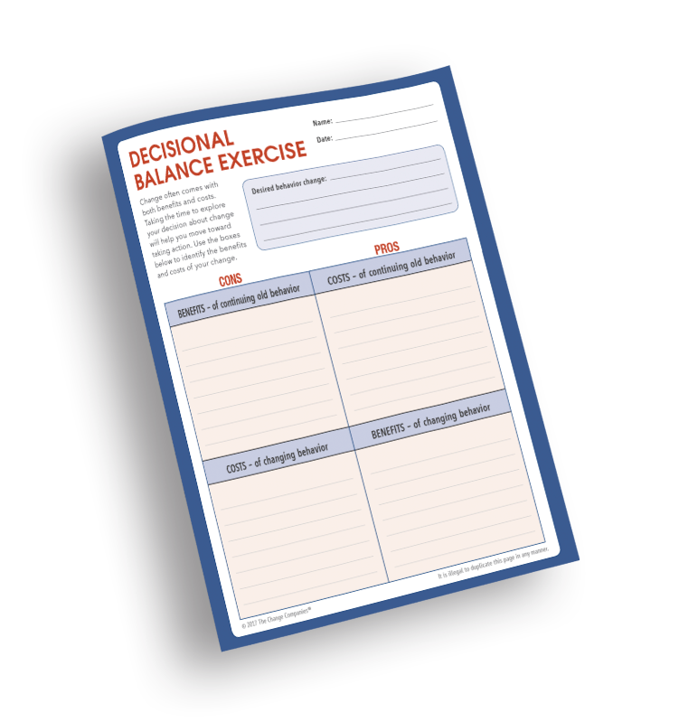 Decisional balance exercises are helpful strategies to assist a participant in addressing ambivalence for any possible behavior change. This check helps participants identify the benefits and costs of change.