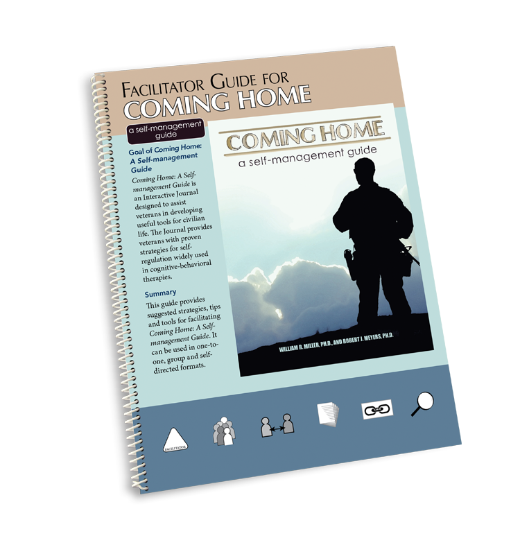 The Facilitator Guide for Coming Home: A Self-management Guide provides direction for effective facilitation of A Self-management Guide. Strengthen facilitation with strategies and techniques for use with individuals or groups. This Guide includes clinician's tips from the Journal authors, Drs. William R. Miller and Robert J. Meyers, that provide suggestions based on their real-life experiences working with veterans. Support your unique facilitation skills with the tips and strategies included throughout this Guide.